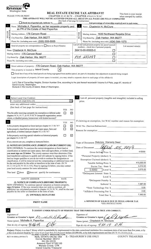 | 2 | 05/02/2019 | WD | Warranty Deed | PAPENFUS, NED / MICHELLE A | MCCLURE, CHADWICK H | | | $415,000.00 | 38372 | 4462721 |