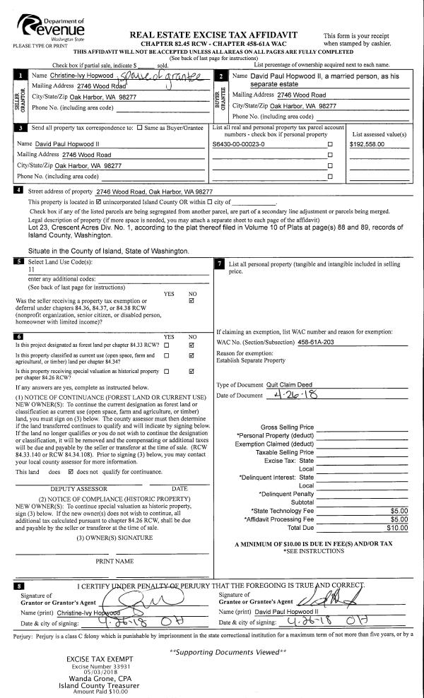 | 1 | 04/26/2018 | QCD | Quit Claim Deed | HOPWOOD II, DAVID PAUL | HOPWOOD II, DAVID PAUL | | | $0.00 | 33931 | 4443641 |