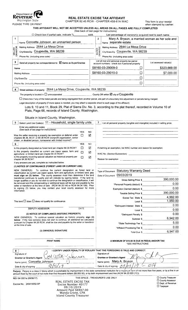 | Mailing Address: | KENNETH H SWANSON, JTWROS 1212 LIBERTY LN OAK HARBOR, WA 98277 | % Ownership: | 100.0000000000% |