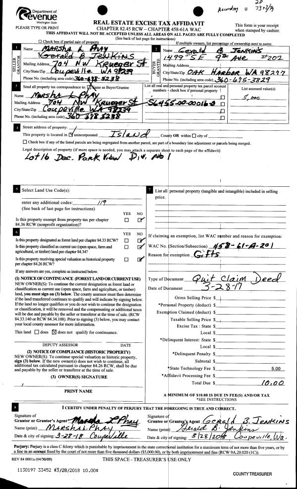 | 1 | 03/28/2017 | QCD | Quit Claim Deed | PHAY, MARSHA L | JENKINS, GERALD B | | | $0.00 | 33452 | 4441562 |
