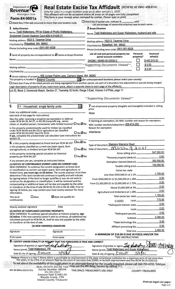 | 2 | 03/09/2021 | WD | Warranty Deed | WALLENBERG, RICHARD D | WALLENBERG, TODD | | | $155,000.00 | 48094 | 4518209 |