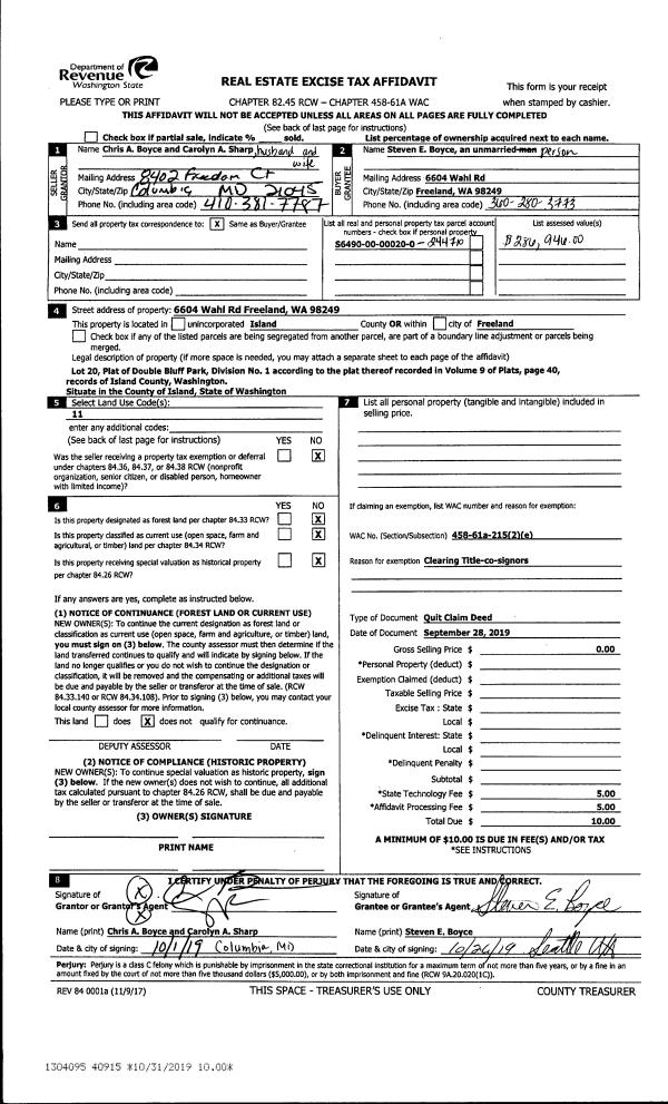 | 3 | 10/28/2019 | QCD | Quit Claim Deed | BOYCE, STEVEN | BOYCE, STEVEN E | | | $0.00 | 40915 | 4474534 |