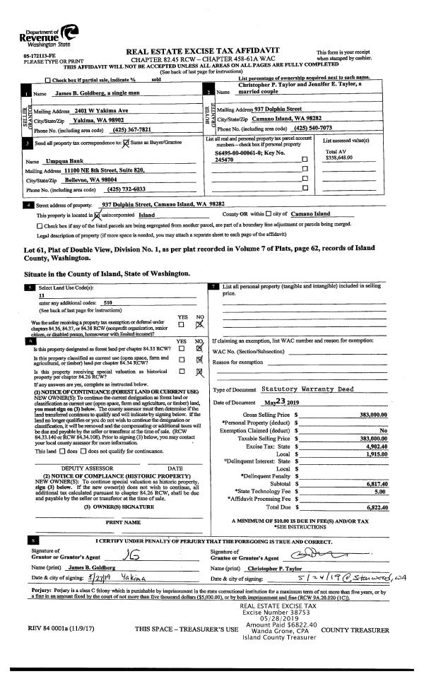 | Mailing Address: | JENNIFER E TAYLOR 937 DOLPHIN ST CAMANO ISLAND, WA 98282 | % Ownership: | 100.0000000000% |