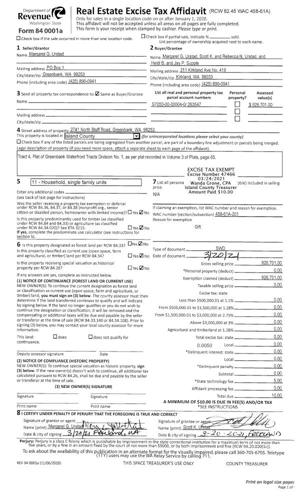 | 3 | 09/30/2020 | WD | Warranty Deed | URSTAD, KENNETH W | URSTAD, MARGARET G | | | $0.00 | 45374 | 4500329 |