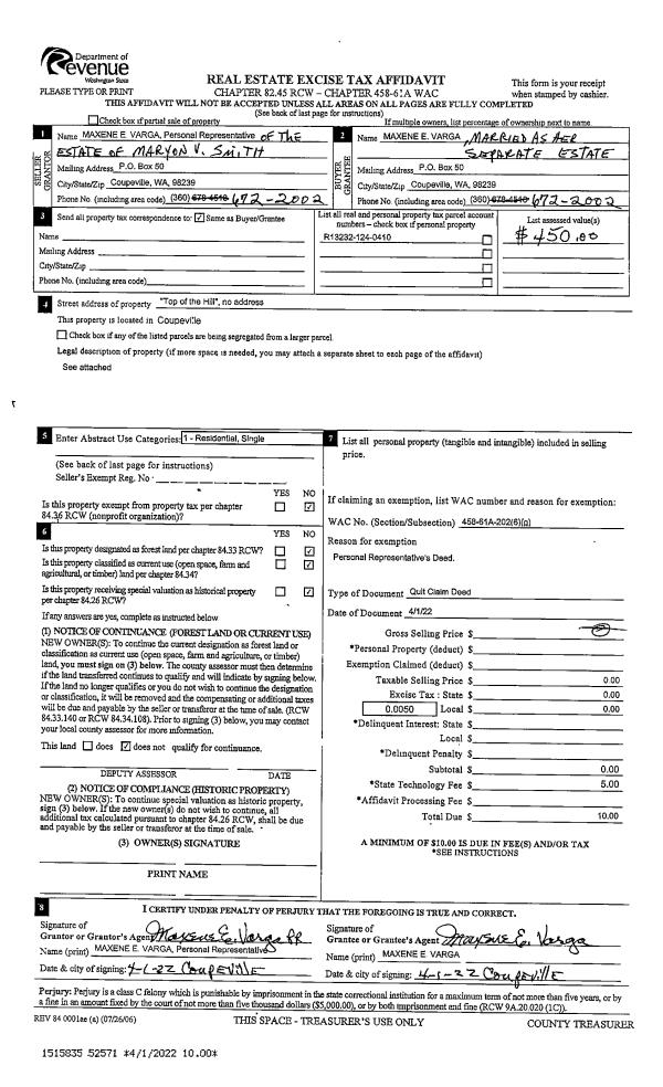 | 1 | 04/01/2022 | QCD | Quit Claim Deed | SMITH, MARYON V | VARGA, MAXENE E | | | $0.00 | 52571 | 4542684 |