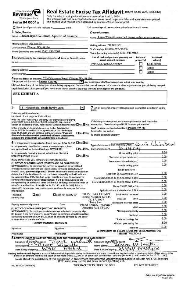 | 1 | 06/14/2024 | QCD | Quit Claim Deed | WILMOTH, TREVOR R | WILMOTH, LAURA | | | $0.00 | 60345 | 453536 |