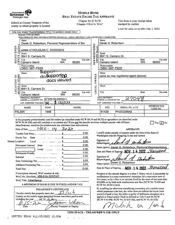 | 1 | 11/14/2022 | MANHOME | Manufactured Home | DODGSON, DOUGLAS | ROBERTSON, DEREK G | | | $0.00 | 55141 | |