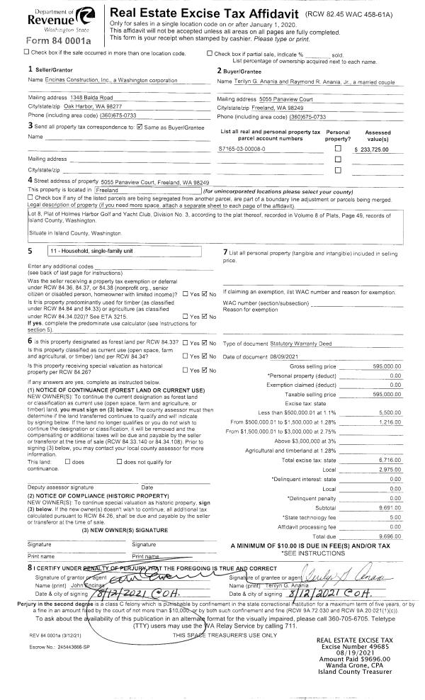 | 1 | 08/09/2021 | WD | Warranty Deed | ENCINAS CONSTRUCTION, INC | ANANIA, TERILYN G | | | $595,000.00 | 49685 | 4527194 |