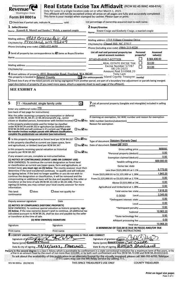 | 2 | 08/25/2023 | WD | Warranty Deed | MERRELL, KENNETH R | CRAIGE, ERNEST | | | $669,000.00 | 57787 | 4564050 |