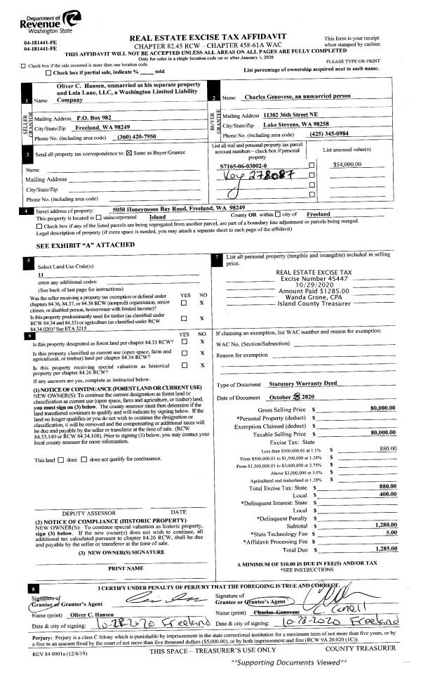 | 2 | 10/28/2020 | WD | Warranty Deed | HANSEN, OLIVER C | GENOVESE, CHARLES | | | $80,000.00 | 45447 | 4500818 |