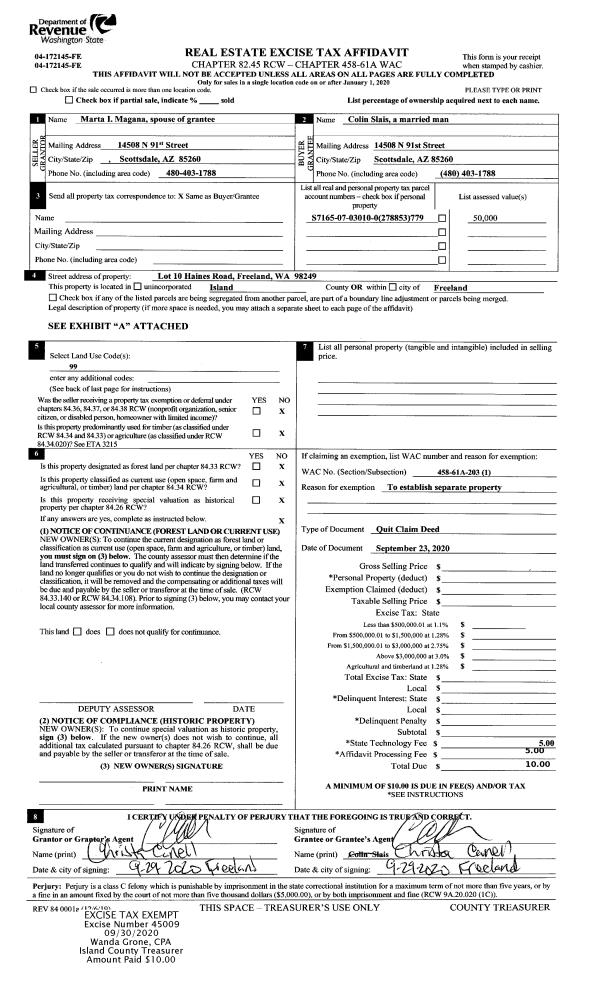 | 1 | 09/23/2020 | QCD | Quit Claim Deed | MAGANA, MARTA I | SLAIS, COLIN | | | $0.00 | 45009 | 4498161 |