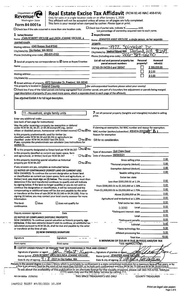 | 1 | 09/08/2021 | QCD | Quit Claim Deed | KROUSE, JOHN ROBERT | KROUSE, JENNIFER ANNE | | | $0.00 | 50257 | 4530412 |