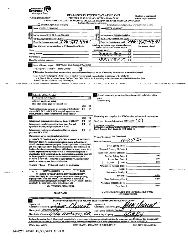 | 1 | 04/25/2021 | QCD | Quit Claim Deed | CHARVAT, JOSEPH F | CHARVAT, MARY P | | | $0.00 | 48340 | 4519817 |