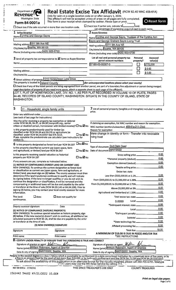 | 1 | 09/07/2022 | QCD | Quit Claim Deed | SAYRE, GEORGE G | SAYRE TTEE, CYNTHIA | | | $0.00 | 54602 | 4551478 |