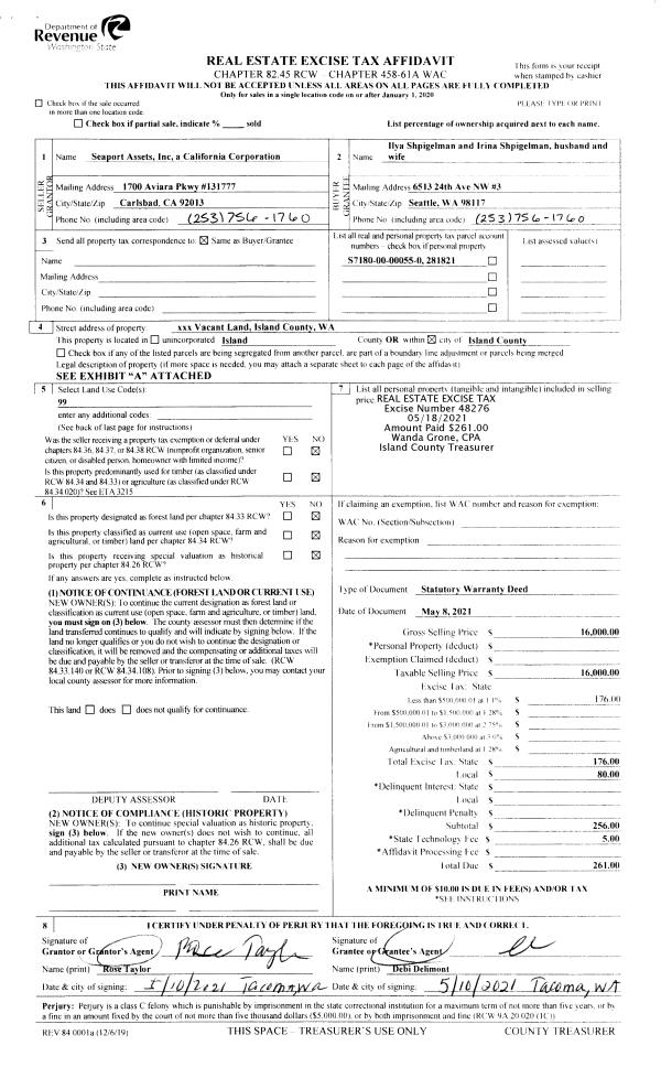 | 1 | 05/08/2021 | WD | Warranty Deed | SEAPORT ASSETS, INC | SHPIGEL, ILYA | | | $16,000.00 | 48276 | 4519544 |