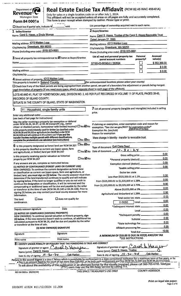 | 1 | 10/30/2024 | QCD | Quit Claim Deed | HAYES, CAROL S | HAYES TTEE, CAROL S | | | $0.00 | 61824 | 4579346 |