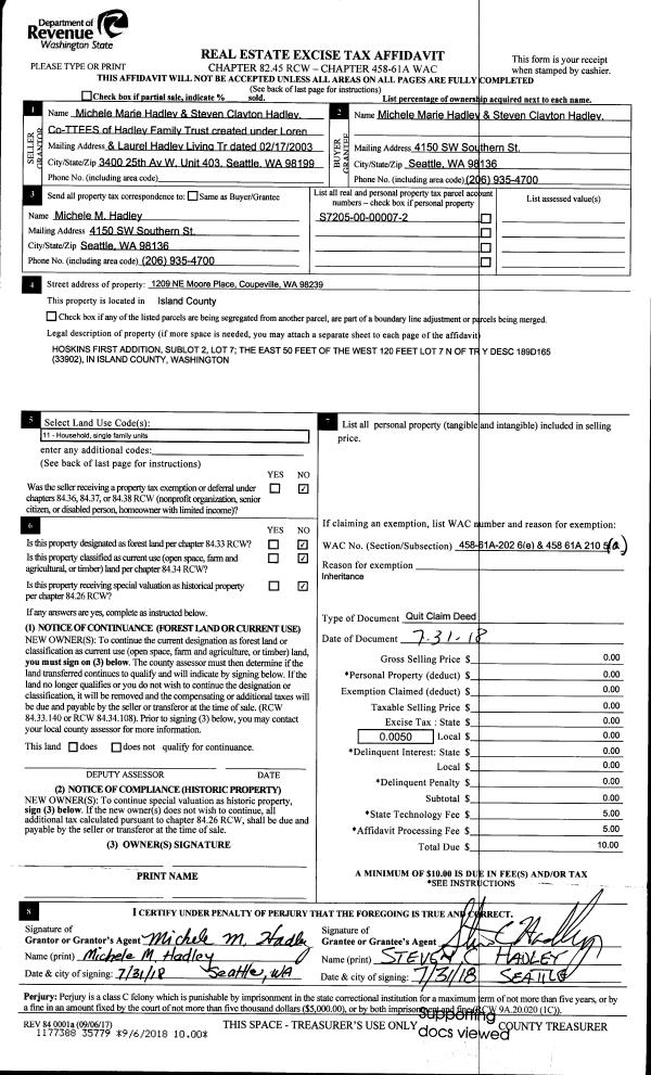 | 2 | 07/31/2018 | QCD | Quit Claim Deed | HADLEY TRUSTEE, LAUREL E | HADLEY, MICHELE MARIE | | | $0.00 | 35779 | 4451235 |