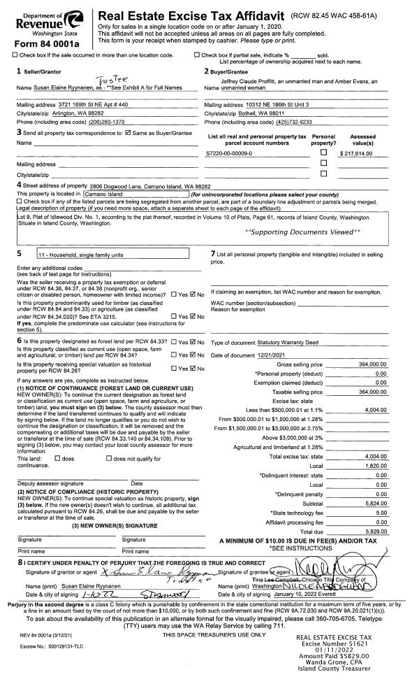 | 1 | 12/21/2021 | WD | Warranty Deed | RYYNANEN TTEE, SUSAN ELAINE | PROFFITT, JEFFREY CLAUDE | | | $364,000.00 | 51621 | 4537661 |