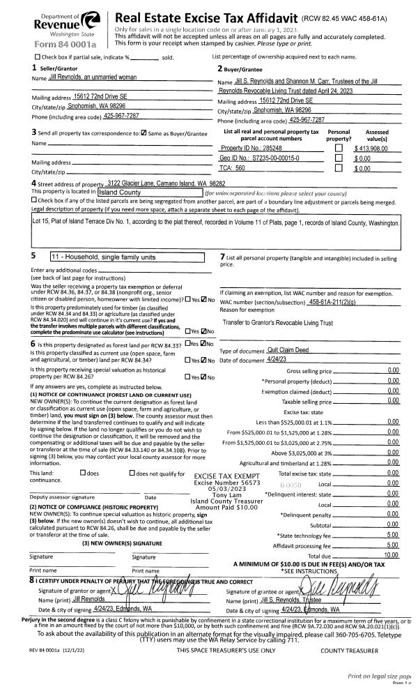 | 1 | 04/24/2023 | QCD | Quit Claim Deed | REYNOLDS, JILL | REYNOLDS TTEE, JILL S. | | | $0.00 | 56573 | 4559461 |