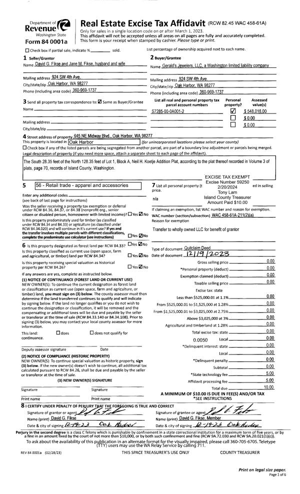 | 1 | 12/19/2023 | QCD | Quit Claim Deed | FIKSE, DAVID G | GERALD'S JEWELERS, LLC | | | $10.00 | 59250 | 4569602 |