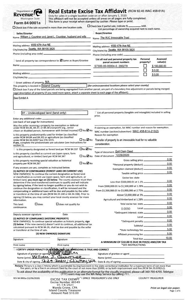 | 1 | 12/29/2020 | QCD | Quit Claim Deed | COUNTNER, WILLIAM J | THE WJC IRREVOCABLE TRUST | | | $0.00 | 46549 | 4508030 |