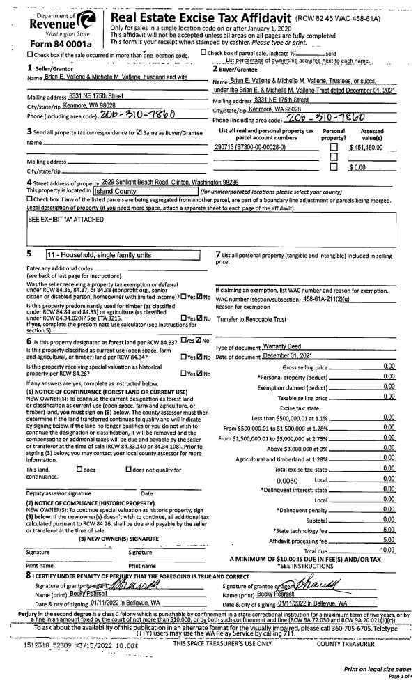 | 1 | 12/01/2021 | WD | Warranty Deed | VALLENE, BRIAN E | VALLENE TTEE, BRIAN E | | | $0.00 | 52309 | 4541560 |
