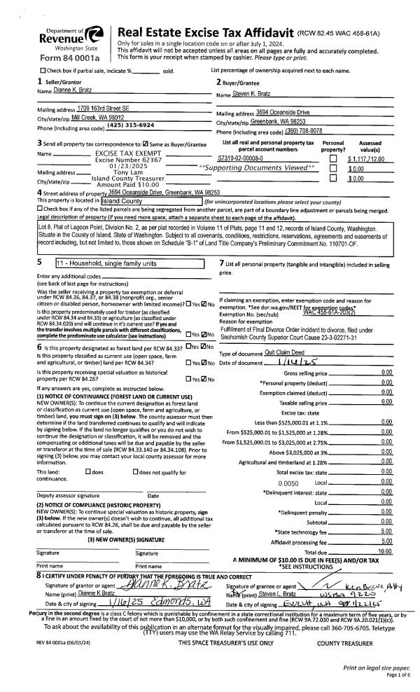 | 1 | 01/16/2025 | QCD | Quit Claim Deed | BRATZ, DIANNE K | BRATZ, STEVEN L | | | $0.00 | 62367 | 4581510 |