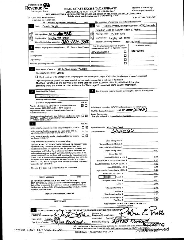 | 1 | 03/18/2020 | QCD | Quit Claim Deed | WHYTE, DAVID J | PREBLE, ROBIN E | | | $0.00 | 42577 | 4484213 |