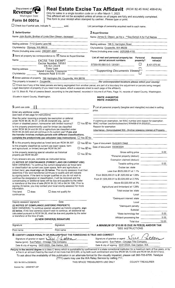 | 4 | 03/28/2024 | QCD | Quit Claim Deed | BUNTIN, JOHN | OLESEN, JAMES D | | | $0.00 | 59561 | 4570862 |
