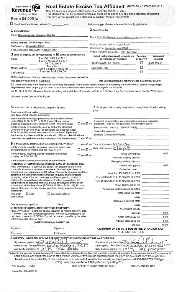 | 1 | 05/08/2025 | QCD | Quit Claim Deed | NZENGE, GEORGE | NZENGE, PRISCILLAH | | | $0.00 | 63422 | 4585602 |