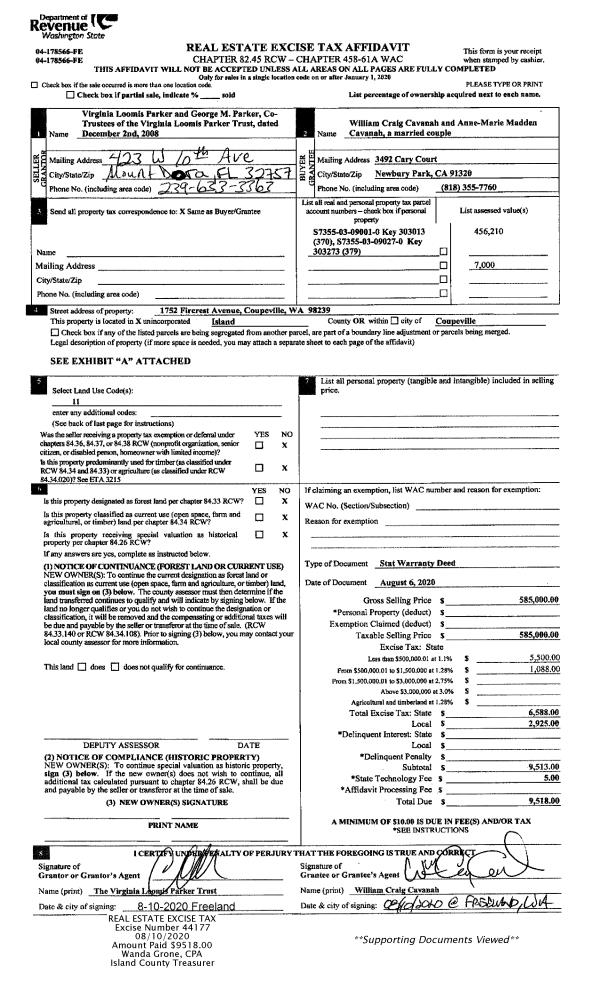 | 1 | 08/06/2020 | WD | Warranty Deed | PARKER TTEE, GEORGE M | CAVANAH, WILLIAM CRAIG | | | $585,000.00 | 44177 | 4493485 |
