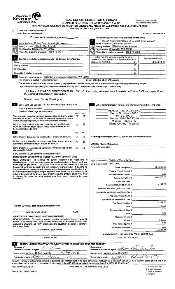 | Mailing Address: | DEBORAH LYNN MCCANN CROMPTON 1826 CEDARCREST AVE COUPEVILLE, WA 98239 | % Ownership: | 100.0000000000% |