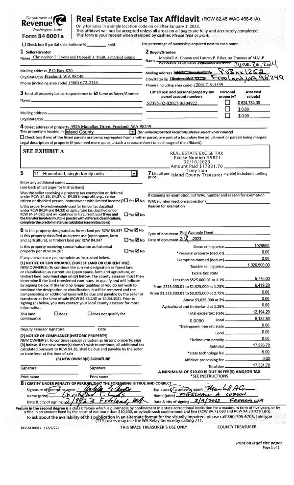 | 1 | 02/09/2023 | WD | Warranty Deed | LYONS, CHRISTOPHER T | CORSON TTEE, MARSHALL A | | | $1,026,500.00 | 55821 | 4556592 |