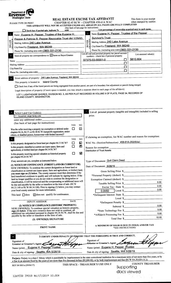| 1 | 05/28/2019 | QCD | Quit Claim Deed | PEPPER, EUGENE H / PATRICIA B | PEPPER TTEE, EUGENE H | | | $0.00 | 39018 | 4465607 |