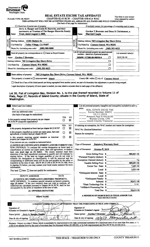 | 1 | 10/09/2019 | WD | Warranty Deed | HUREVITZ TRUSTEE, LINDA B | BREWSTER, GORDON T | | | $585,000.00 | 40655 | 4473190 |