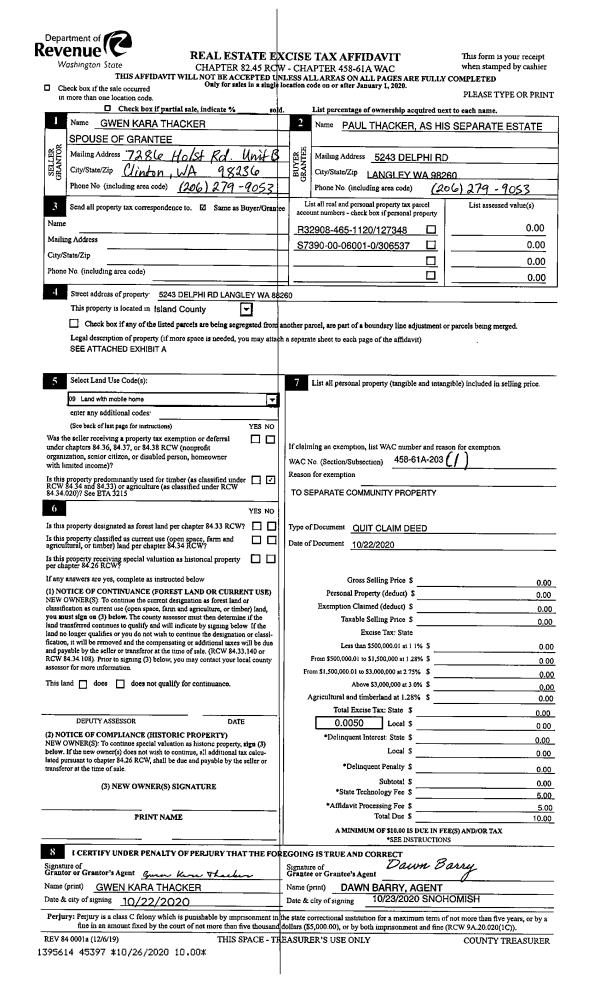 | 2 | 10/22/2020 | QCD | Quit Claim Deed | THACKER, KARA | THACKER, PAUL | | | $0.00 | 45397 | 4500434 |