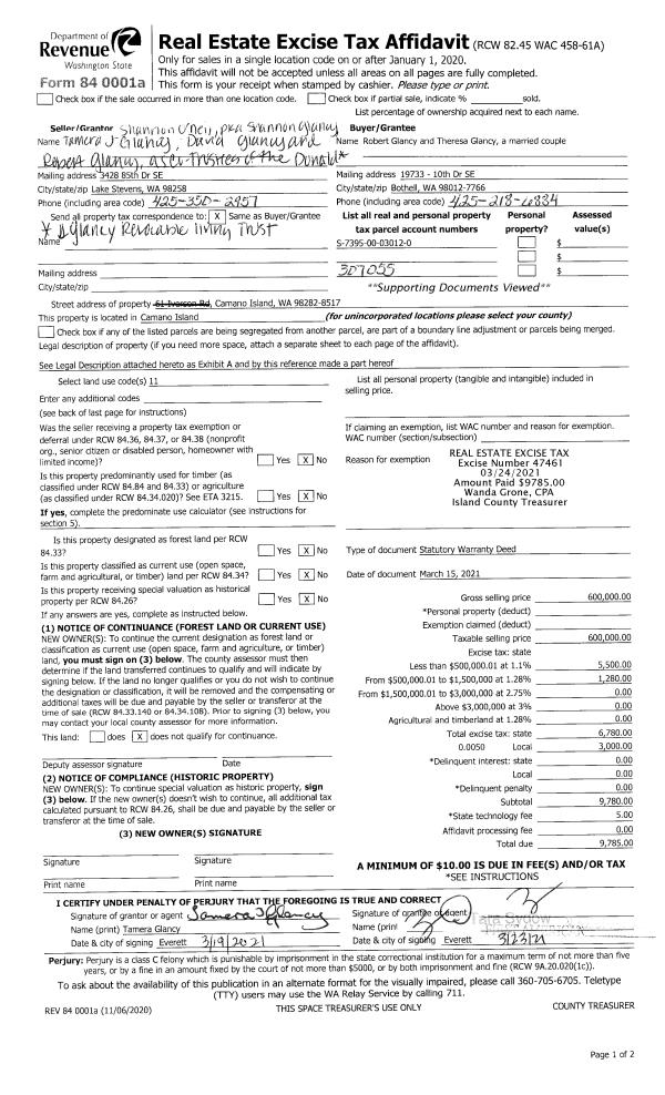 | 2 | 03/15/2021 | WD | Warranty Deed | GLANCY TRUSTEE, DONALD L | GLANCY, ROBERT | | | $600,000.00 | 47461 | 4514428 |