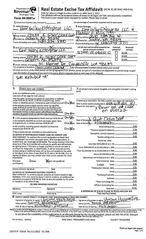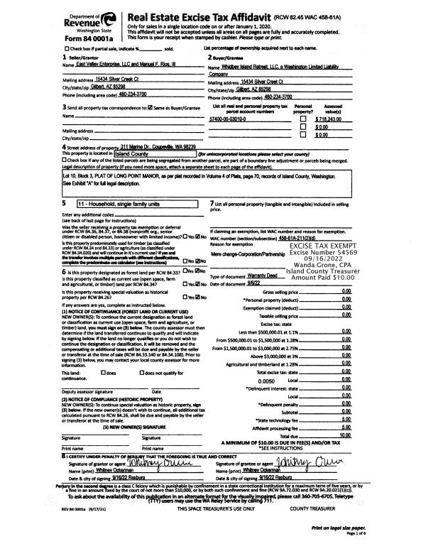 | 1 | 09/06/2022 | QCD | Quit Claim Deed | EAST VALLEY ENTERPRISE, LLC | WHIDBEY ISLAND RETREAT, LLC | | | $0.00 | 54569 | 4551338 |