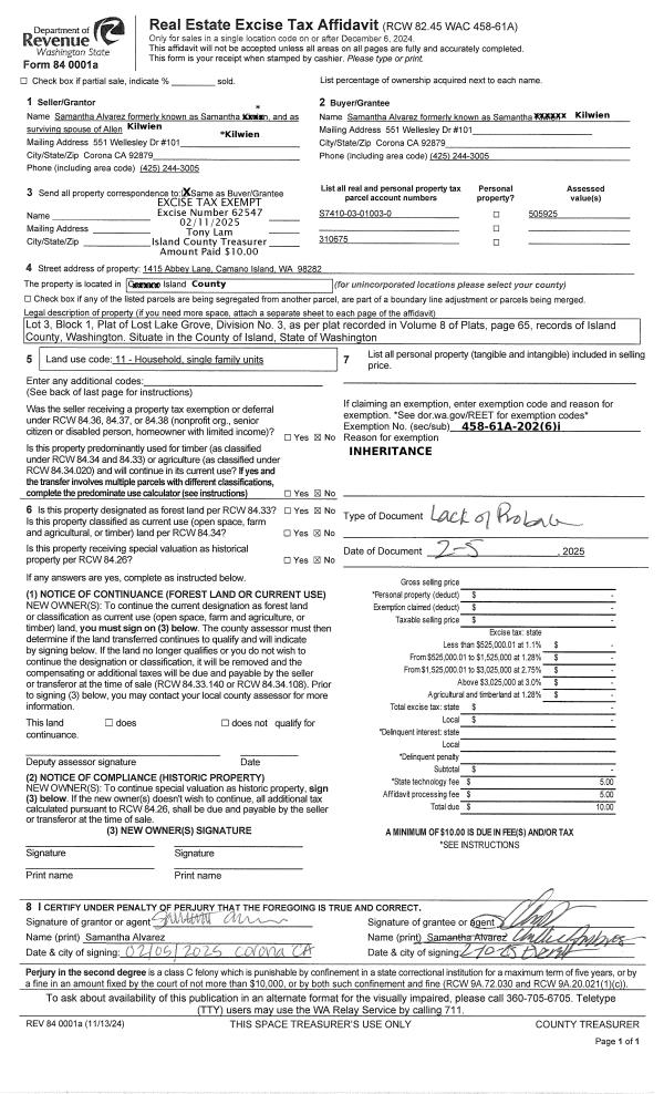 | 2 | 02/05/2025 | LACPROBATE | Lack of Probate | ALVAREZ, SAMANTHA | ALVAREZ, SAMANTHA | | | $0.00 | 62547 | 4582175 |