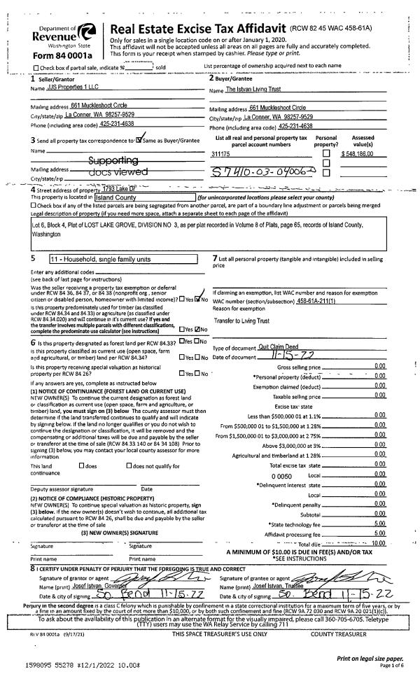 | 1 | 11/15/2022 | QCD | Quit Claim Deed | JJS PROPERTIES 1, LLC | THE ISTVAN LIVING TRUST | | | $0.00 | 55278 | 4554388 |