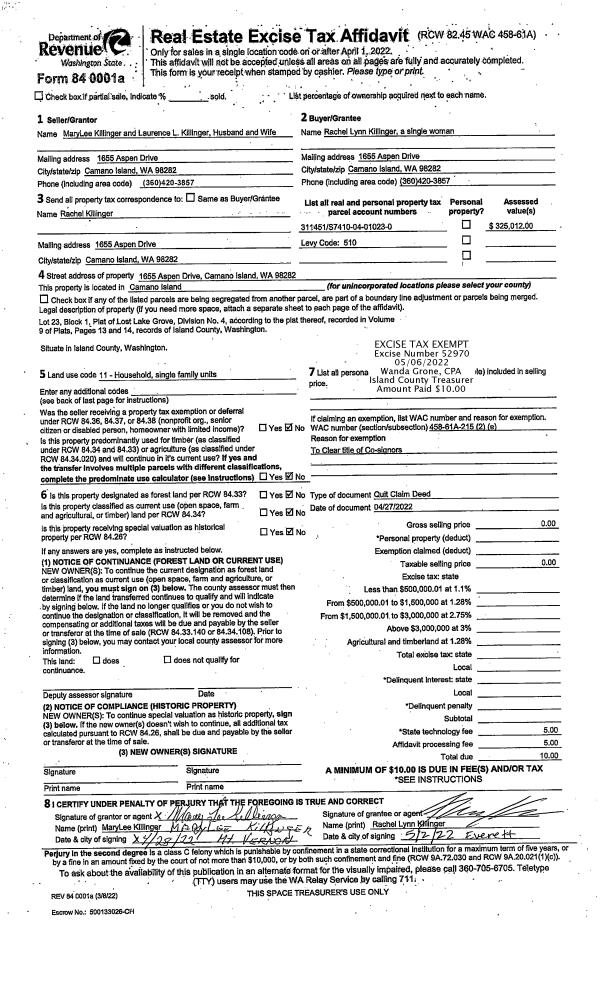 | 1 | 04/27/2022 | QCD | Quit Claim Deed | KILLINGER, LAURENCE L | KILLINGER, RACHEL LYNN | | | $0.00 | 52970 | 4544653 |