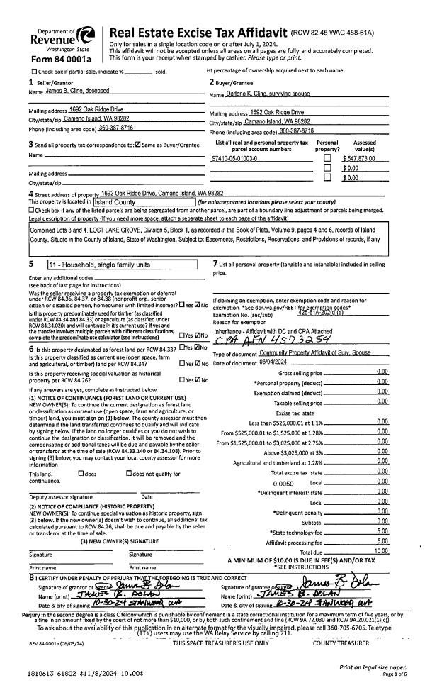 | 1 | 06/04/2002 | CPADC | Comm Prop Agmnt & Death Cert | CLINE, JAMES B | CLINE, DARLENE K | | | $0.00 | 61802 | 4573254 |