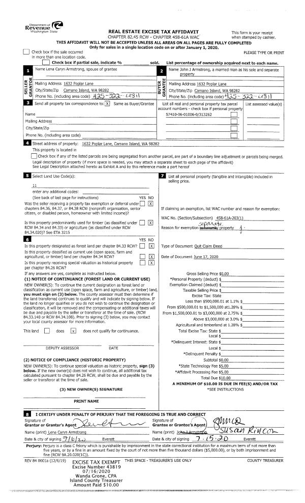 | 1 | 06/17/2020 | QCD | Quit Claim Deed | ARMSTRONG, LENA CARYN | ARMSTRONG, JOHN J | | | $0.00 | 43819 | 4491368 |