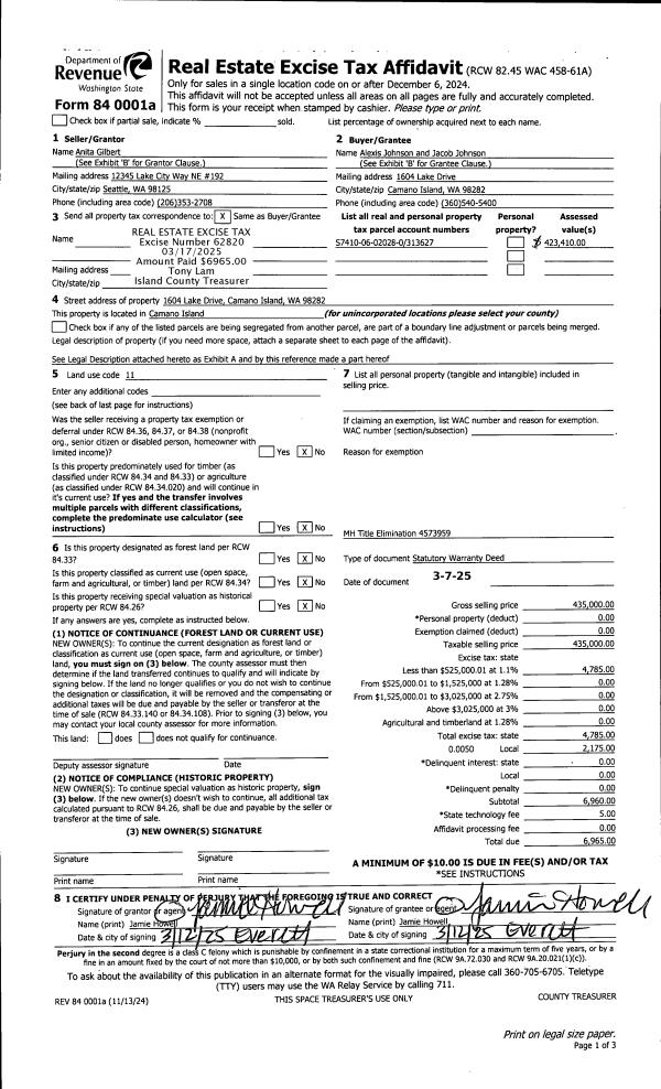 | Mailing Address: | JACOB JOHNSON 1604 LAKE DR CAMANO ISLAND, WA 98282 | % Ownership: | 100.0000000000% |