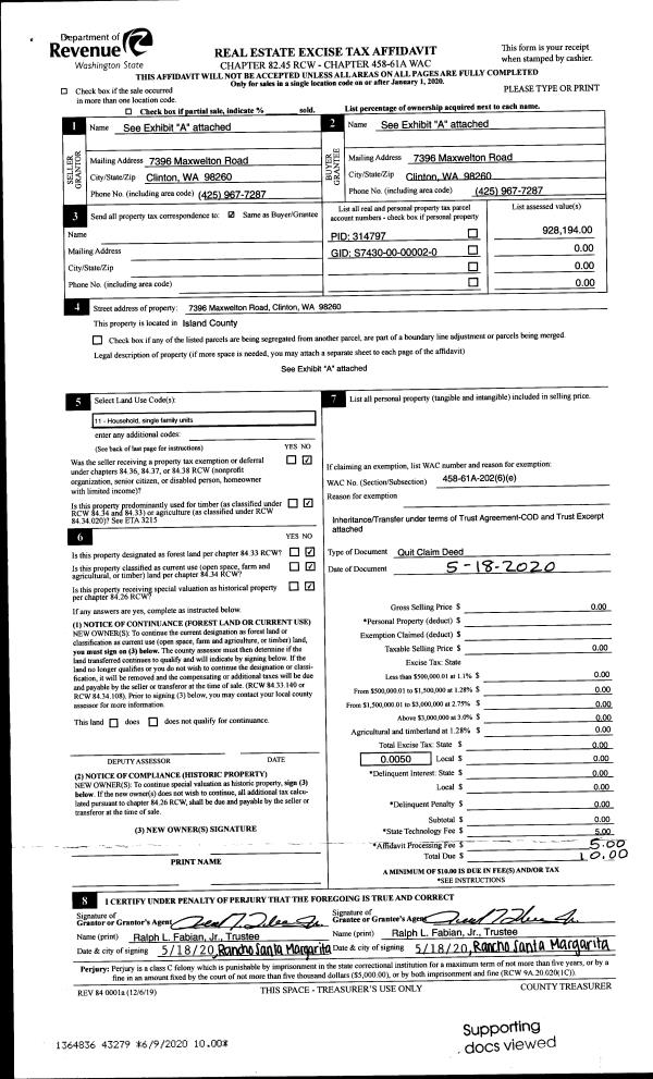 | 1 | 05/18/2020 | QCD | Quit Claim Deed | FABIAN TRUSTEE 50% INT, RALPH | FABIAN JR TTEE, RALPH L | | | $0.00 | 43279 | 4488388 |