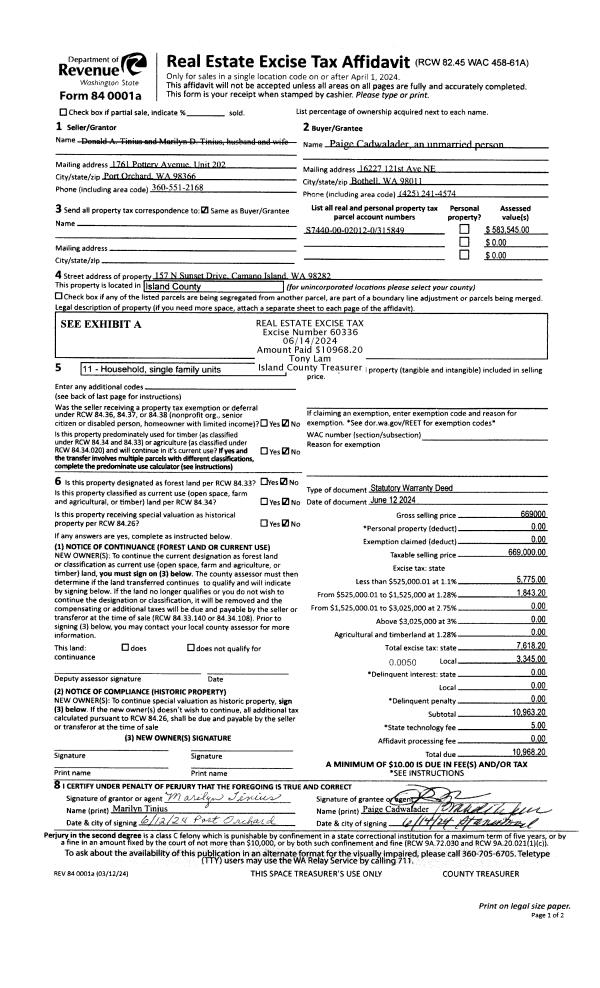 | 1 | 06/12/2024 | WD | Warranty Deed | TINIUS, DONALD A | CADWALADER, PAIGE | | | $669,000.00 | 60336 | 4573486 |