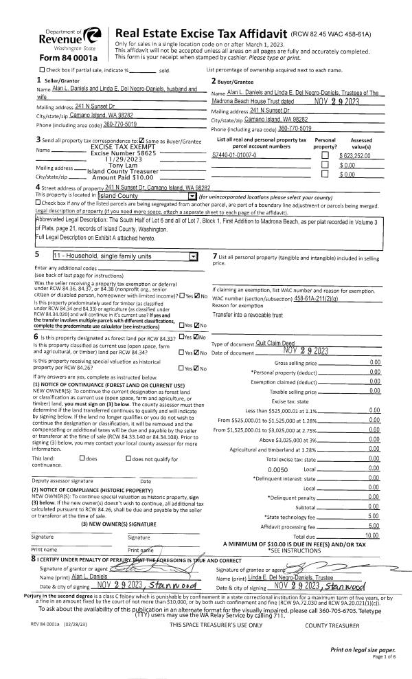 | Mailing Address: | LINDA E DEL NEGRO-DANIELS TTEE 241 N SUNSET DR CAMANO ISLAND, WA 98282 | % Ownership: | 100.0000000000% |