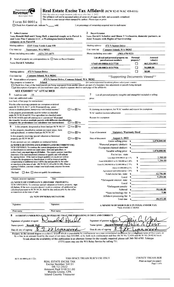 | 1 | 08/01/2022 | WD | Warranty Deed | LONE PINE CAMANO LLC | SCHULTZE JTWROS, DAVID E | | | $1,070,000.00 | 54131 | 4549551 |