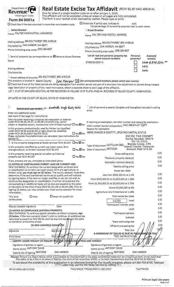 | 1 | 08/07/2020 | QCD | Quit Claim Deed | WASHINGTON, WALTER | WASHINGTON, WALTER | | | $0.00 | 44679 | 4496159 |