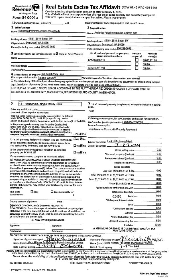 | 1 | 05/01/2024 | PRD | Personal Representatives Deed | ESTATE OF ANDONIOS POLYCHRONOPOULOS | ROBINSON, FELETSA D | | | $0.00 | 60241 | 4573217 |